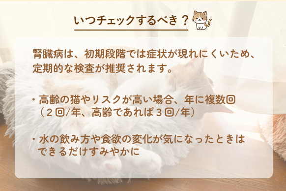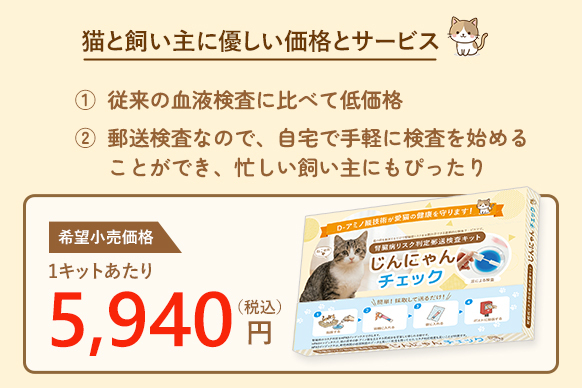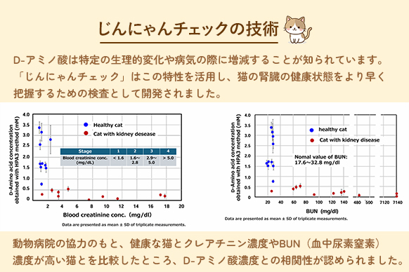 尿中のD-アミノ酸の数値から腎臓病のリスクを判定できる技術に基づき「じんにゃんチェック」は生まれました。この方法は動物病院の血液検査のデータと高い一致性を持っており、正確性も高いです。しかも、血液を取る必要がないため、猫にも飼い主にもストレスが少ないのが特長です。検査は尿を採取して送るだけで簡単です。また2週間程度で結果が返送されますので早期発見に繋がり、大切な愛猫の寿命を延ばすことが期待できます。